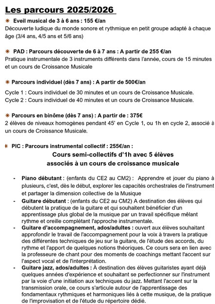 En une seule visite, vous pouvez : ✅ Choisir votre horaire de cours d’instrument avec votre professeur. ✅ Vous inscrire au cours de croissance musicale (obligatoire pour les -13 ans, mais ouvert à tous !). ✅ Rejoindre une pratique collective (orchestre, chorale, groupe…). ✅ Pour les 7-8 ans, Découvrir plusieurs instruments avec le parcours découverte (idéal pour les indécis !). ✅ Inscrire les plus petits au cours d’éveil (ludique et adapté aux 3–6 ans).✅Remplir-signer-régler le dossier administratif,